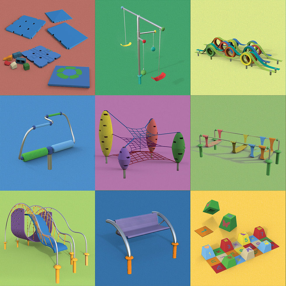 The modular set of equipment is designed to fully utilize the structural and visual capabilities of recycled rubber, as well as a variety of preexisting rubber elements, while stainless steel is used to add rigidity where necessary.